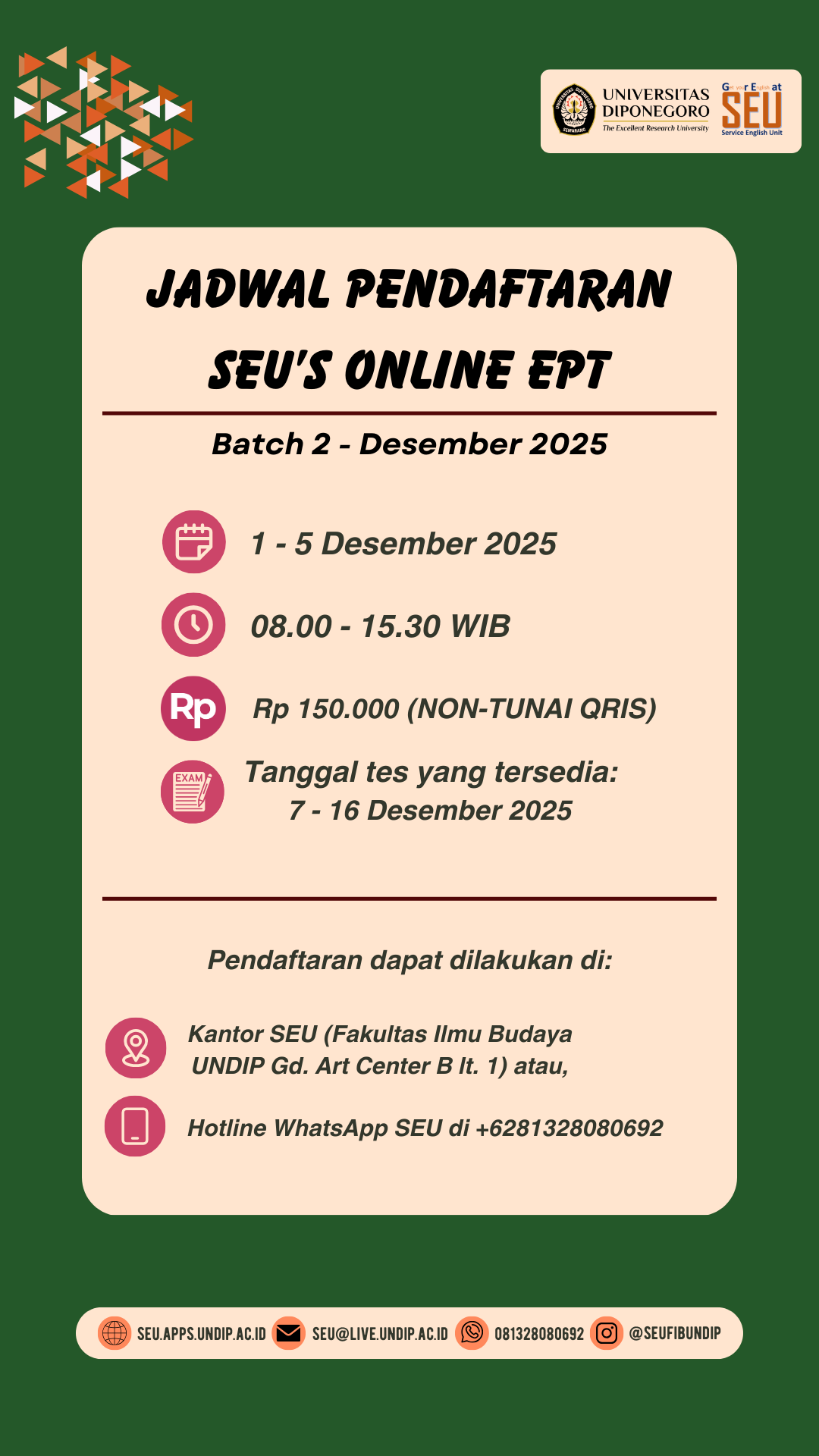 Pendaftaran SEU's Online EPT batch 2 - Desember 2025 akan dibuka pada hari Senin s.d. Jumat, 1 - 5 Desember 2025 pukul 08.00 - 15.30 WIB.
